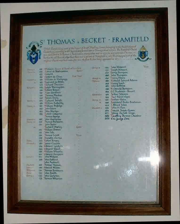 A roll of past Vicars from 1185 (William) to 2000 (Eric George Doré - the present incumbent