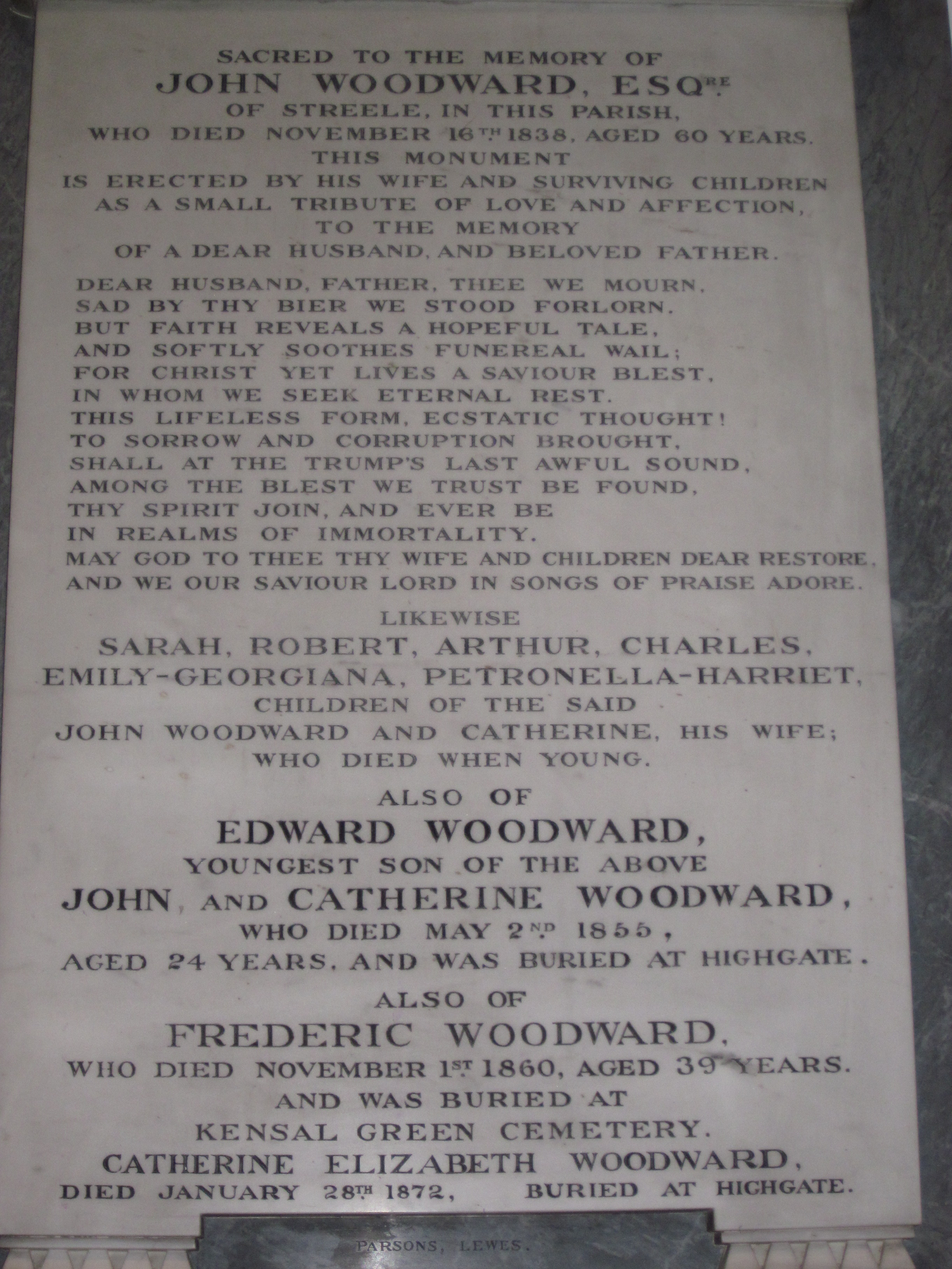 Sacred to the memory of John Woodward Esq. of Streele in this parish, who died November 16th 1838 aged 60 years. This monument is erected by his wife and surviving children as a small tribute of love and affection to the memory of a dear husband and beloved father.